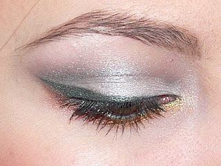Jesień jest na dolnej powiece - cała gama jesiennych barw od złotego po brąz. Kreskę zrobiona czarnym, żelowym eyelinerem przetarłam perłowym zielonym, bo nadal zieleń jest obecna na niektórych roślinkach. Na górną powiekę spadł śnieg i przykrył jesień - perłowa biel, srebro i szarości. Rzęsy troszkę zmroził srebrny tusz. Do tego mocno zaróżowione policzki i naturalne, różowe usta.