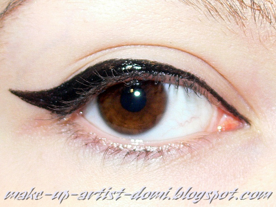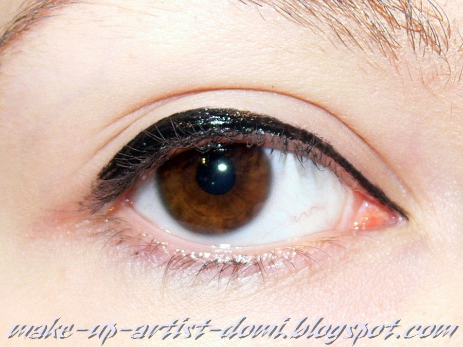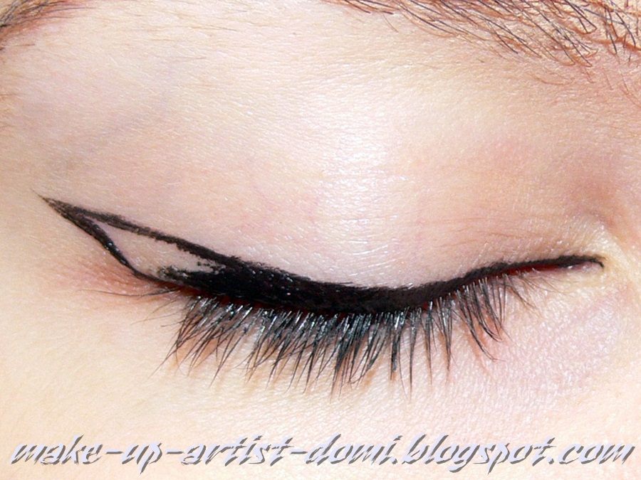 Ta "idealna" kreska jaskółka jest wyciągnięta lekko do góry wzdłuż takiej domniemanej (przeze mnie tu dorysowanej czerwonej) linii, która jest przedłużeniem dolnej powieki. Przy wewnętrznym kąciku jest cienka i stopniowo coraz grubsza do zewnętrznej części oka.
