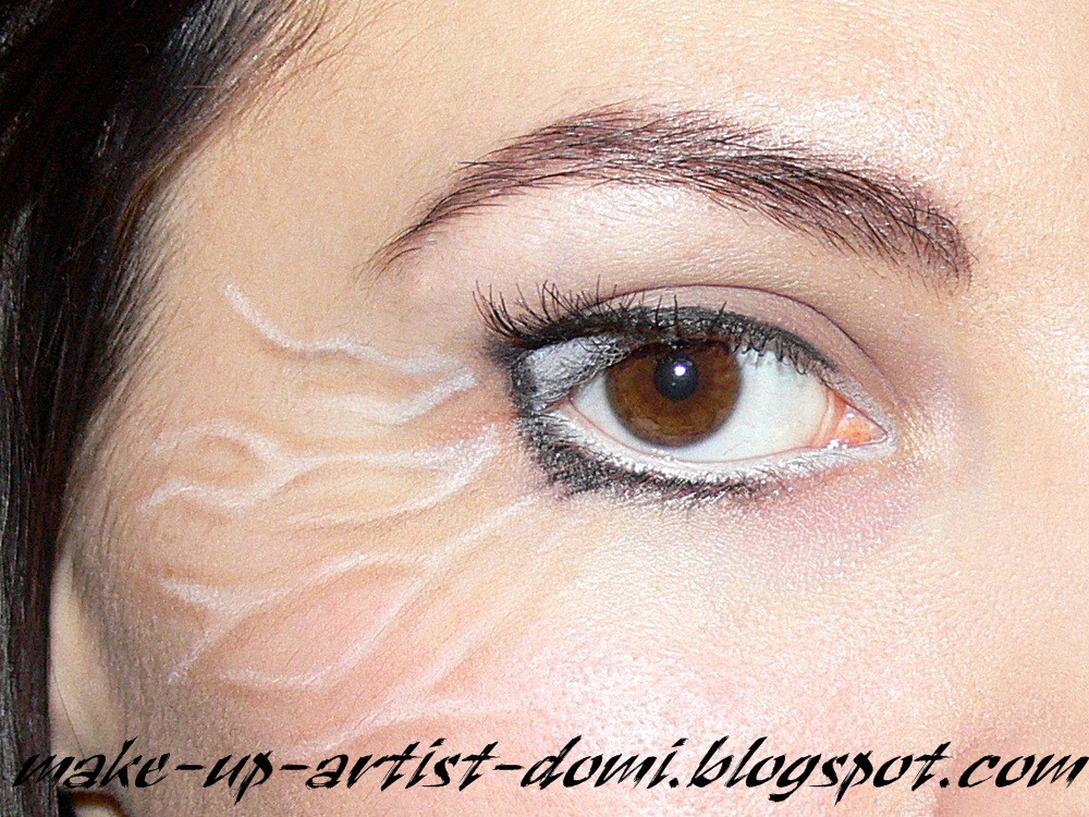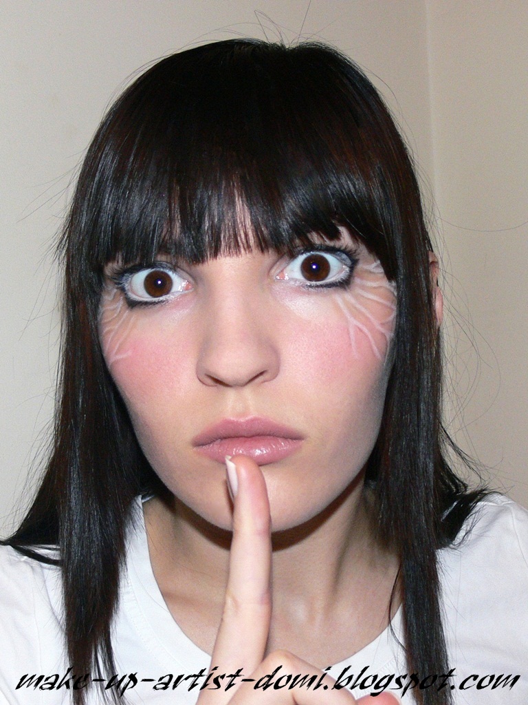 Nigdy nie używałam sztucznych rzęs w taki sposób, ale efekt wydaje mi się zadowalający. Białą kredką też wybieliłam trochę rzęsy, żeby ich tak bardzo nie było widać i powstał trochę lepszy efekt oka anime. Żyłki wokół oka zrobiłam również białą kredką i wybiłam je brązowymi cieniami.