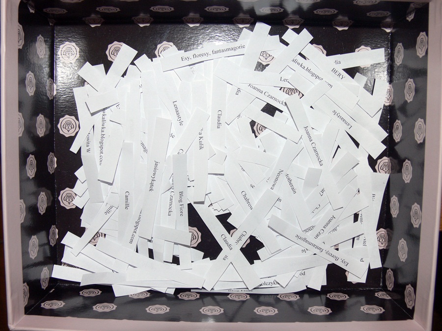 Dzisiaj już jako nowa ja wylosowałam zwyciężczynię w moim rozdaniu! Za pomoc w realizacji dziękujcie mojej siostrze oraz komisji kontroli gier i zakładów. Ile ja się nasprawdzałam Waszych losów! Niestety nie wszyscy spełnili wszystkie warunki, a szkoda, bo nagrody były tego warte.
