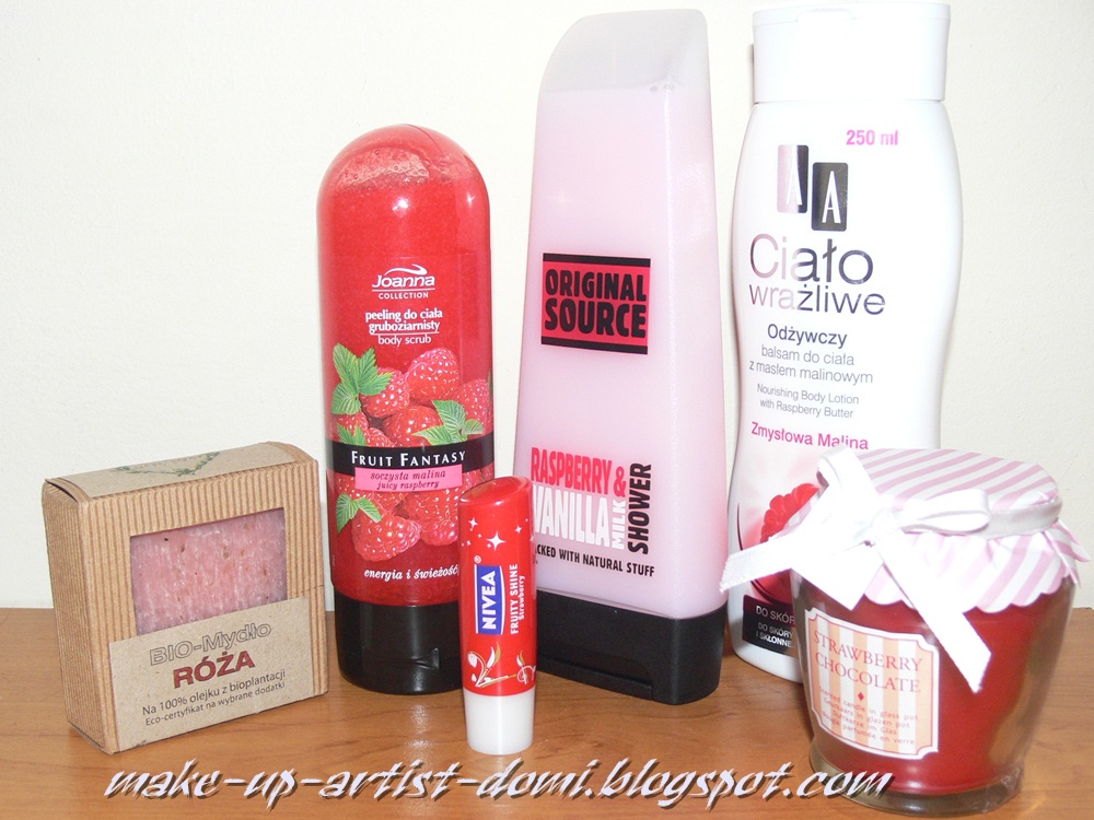 W komplecie z pigmentami dostałam też mydełko różane, a od drugiej przyjaciółki zestaw malinowych kosmetyków, truskawkową pomadkę i świeczkę zapachową. Uwielbiam maliny i dla mnie wszystko pachnie po prostu cudnie!