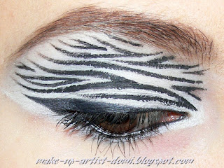 To oczywiście zebra! Eyeliner w pędzelku trochę mi odmawiał współpracy na tej grubej warstwie kredki i białego matowego cienia, ale zmusiłam go do jakiegoś minimum i makijaż ostatecznie powstał. Czuję się dziko i to strasznie fajne uczucie. Po prostu jak zebra!