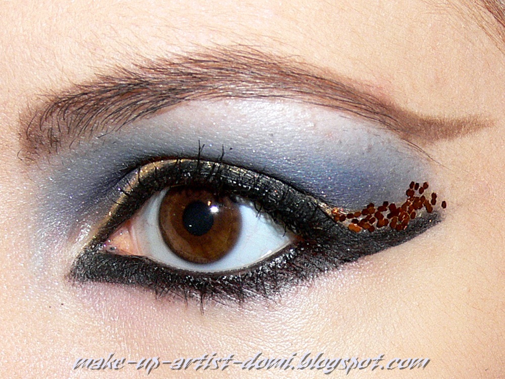 Mamy tu charakterystyczne dla faraonów mocno zaznaczone oko i typowe dla przedstawień Kleopatry niebieskości. Aby był to bardziej bogaty, królewski makijaż, dodałam złoty pyłek między czarną kreską a granatem oraz przykleiłam złoty brokat. Typowe są również przedłużone brwi, które widnieją na starożytnych przedstawieniach Kleopatry. Bawiłam się przy tym świetnie.