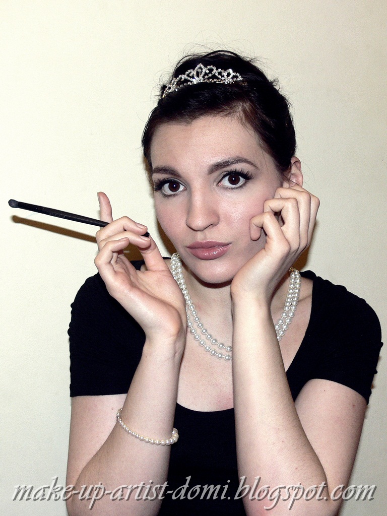 Co jest charakterystyczne dla stylu Audrey to mocno podkreślone, grube brwi i czarna kreska eyelinerem. W tym konkretnym makijażu starałam się uzyskać efekt lekko zaokrąglonego, dużego oka, co mi się udało poprzez właśnie użycie cielistej kredki na linii wodnej oraz podkreślenie dolnej powieki szarym i brązowym cieniem, a do tego sztuczne rzęsy jeszcze bardziej otworzyły i powiększyły mi oko. Konturowania twarzy minimalne, a raczej nadanie świeżości różem i delikatne rozświetlenie szczytów kości policzkowych. Et voila! Pędzel w roli fajki i gotowe. ;)