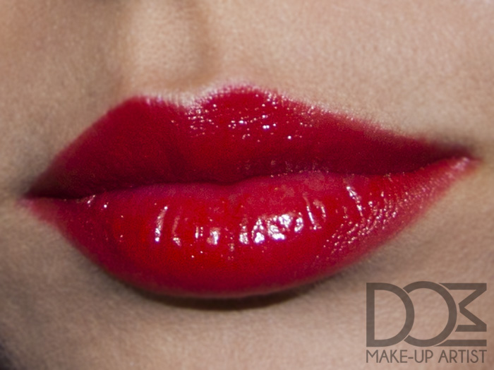 Górna powieka w odcieniach beżu i złota. Załamanie podkreślone brązem, który roztarłam do góry beżem. Klasyczna czarna kreska. Dolna powieka podkreślona brązem, ciemnym złotem i jaśniejszym złotem przy wewnętrznym kąciku. Na linii wodnej cielista kredka, aby optycznie otworzyć i powiększyć oko. Na ustach króluje mój ukochany odcień czerwieni.