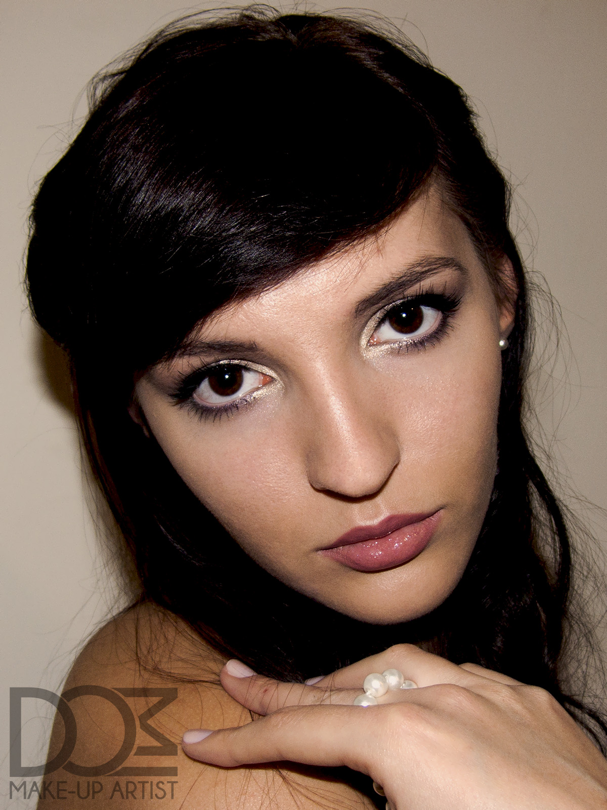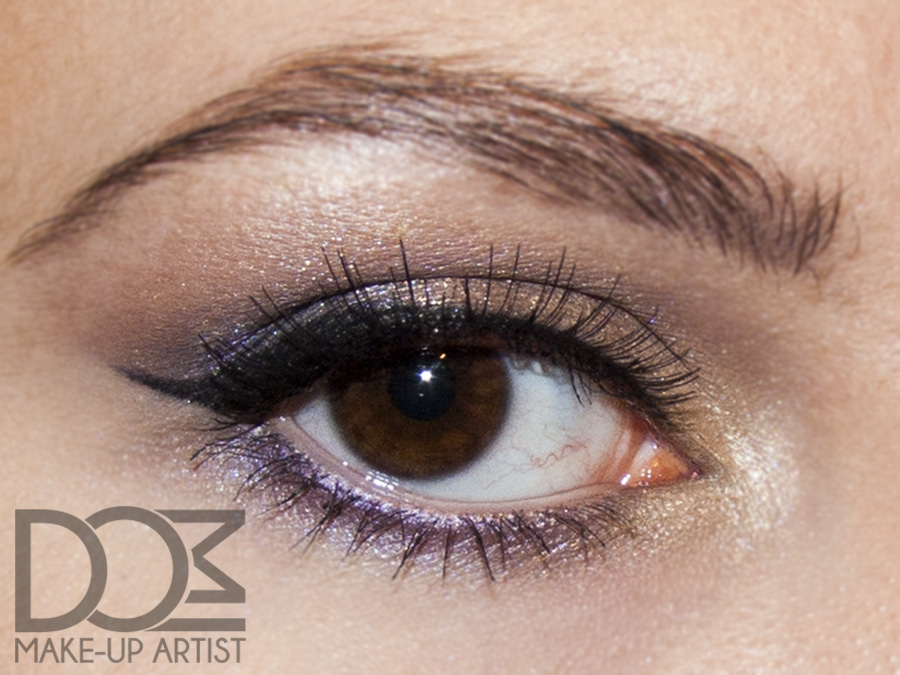 Jasne złoto w kąciku wewnętrznym. Dalej na powiece ruchomej ciemniejsze złoto. Zewnętrzny kącik przyciemniony zimnym fioletem. Całość roztarta do góry średnim brązem matowym. Dolna powieka podkreślona tym samym fioletem.