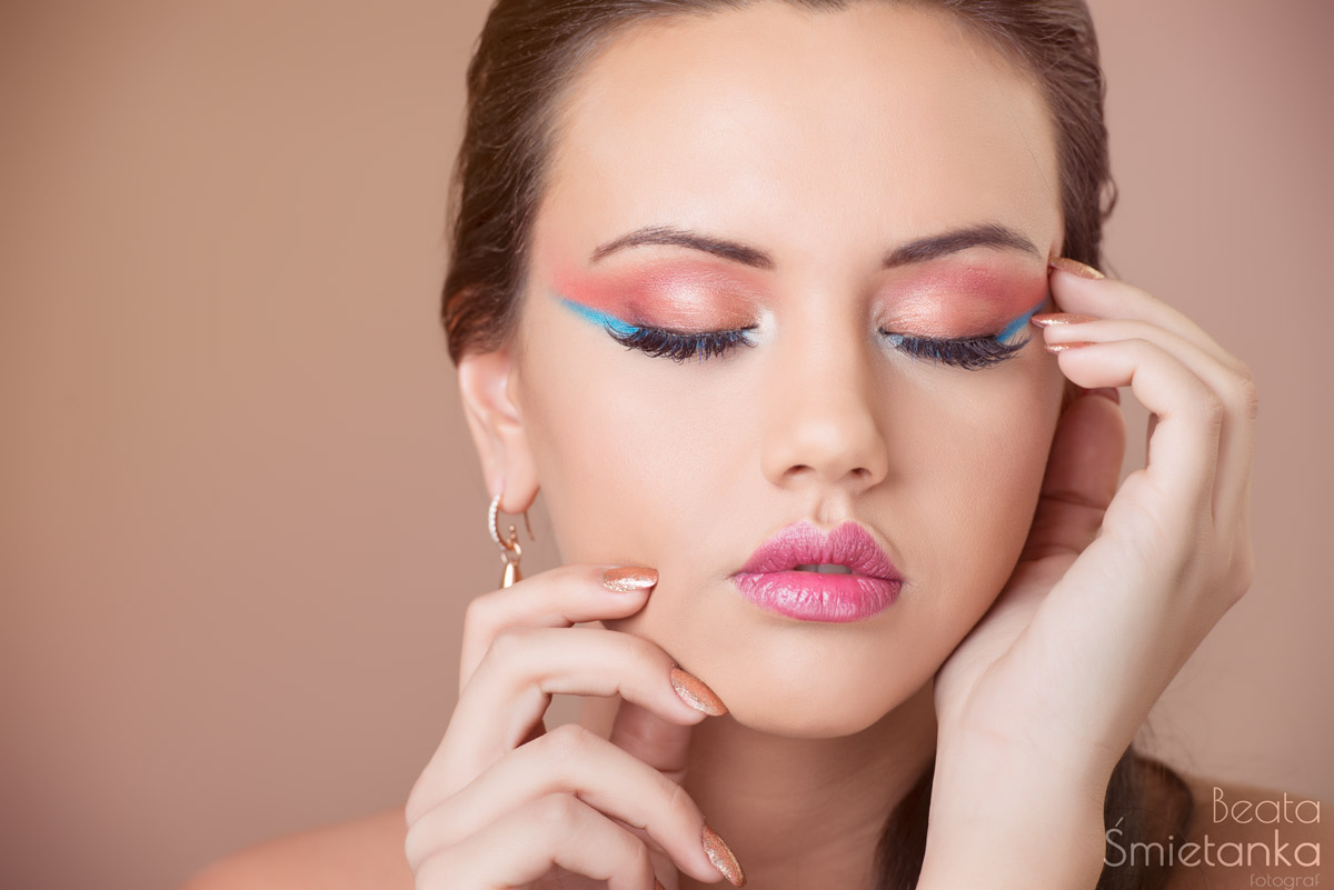 Podkład Pierre Rene Skin Balance odcień 25 natural, puder ryżowy Pierre Rene, cień Pierre Rene 145 Coral, cień MIYO OMG! Eyeshadows 13 Chili, cień Pierre Rene 063 Baltic Marine (w śladowej ilości), maskara MIYO Big Fat Smoky Lashes Mascara.