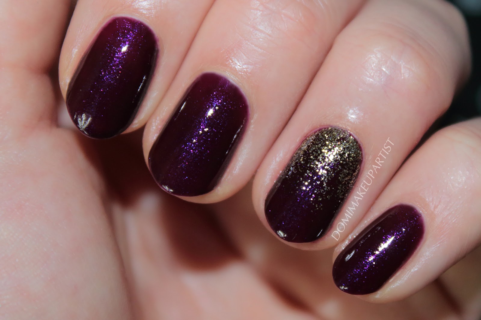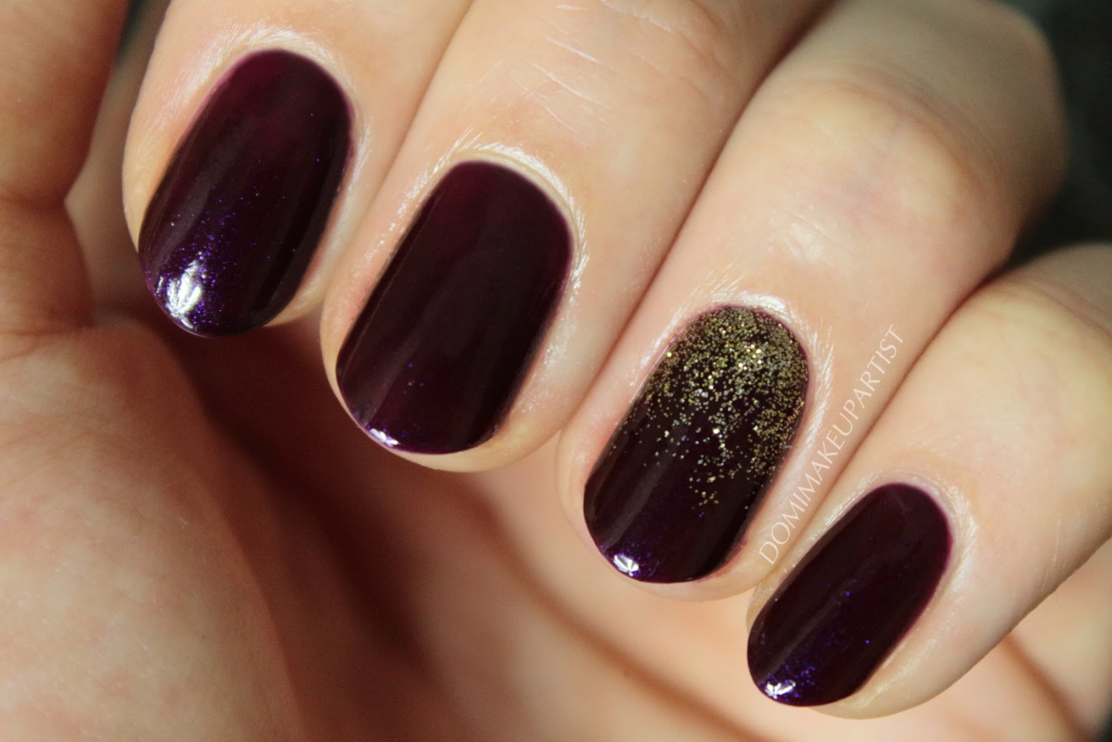 Na dobry początek roku sięgnęłam po jeden z moich ulubionych lakierów wszech czasów. Tak, wszech czasów, bo kocham go już od liceum kiedy to odkryłam go u jednej z moich koleżanek i od tamtej pory nasza miłość nieprzerwanie trwa i będzie trwać. Mam na myśli kolor 177 z Inglota. Jest to taki piękny ciemny śliwkowy odcień z różowymi i niebieskimi drobinkami, które na pierwszy rzut oka są niewidoczne i dopiero po chwili można dostrzec jak się subtelnie mienią. Ten lakier sam w sobie wygląda nieziemsko i zawsze przyciąga uwagę. Właściwie mogłam go zostawić solo, ale tym razem postanowiłam dodać mu jakiś dodatkowy brokatowy akcent. Pokusiłam się o proste brokatowe ombre na kciuku i palcu serdecznym. Posłużył mi do tego lakier z OPI ze świątecznej kolekcji Mariah Carey All Sparkly and Gold.