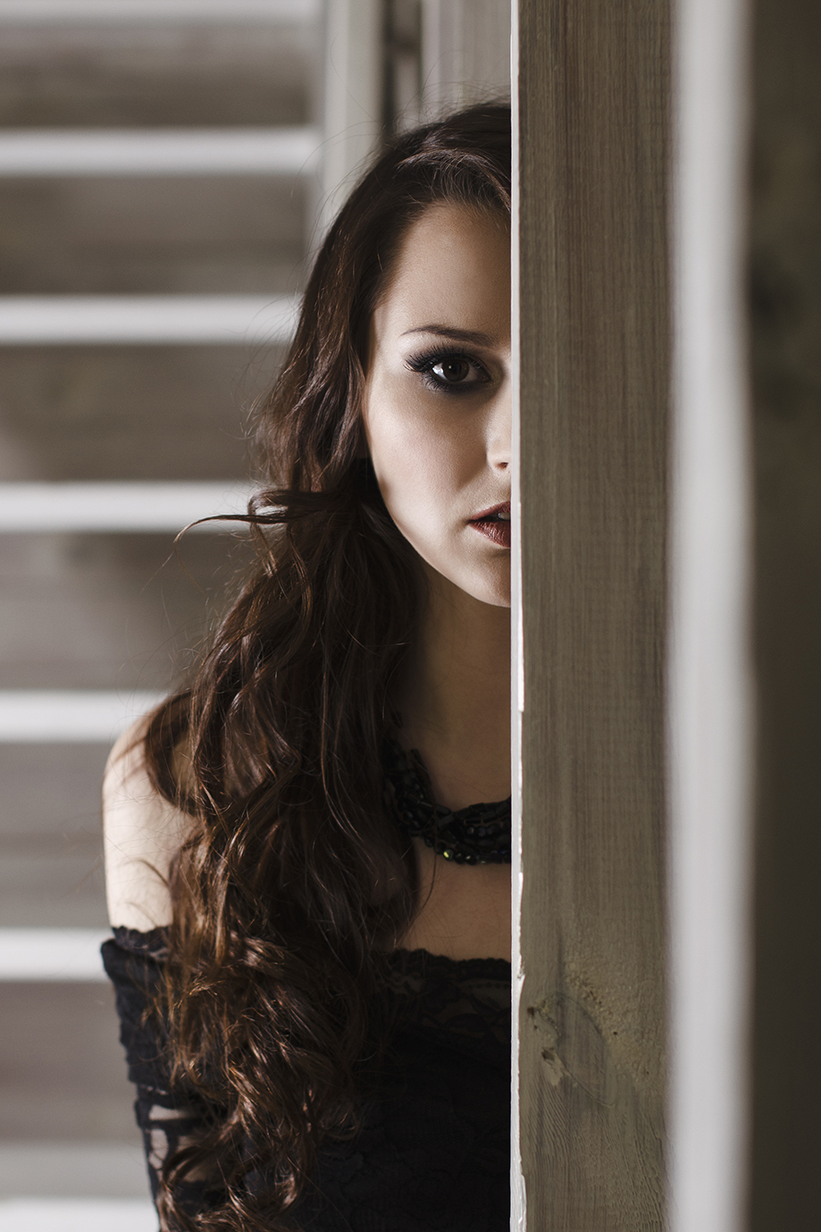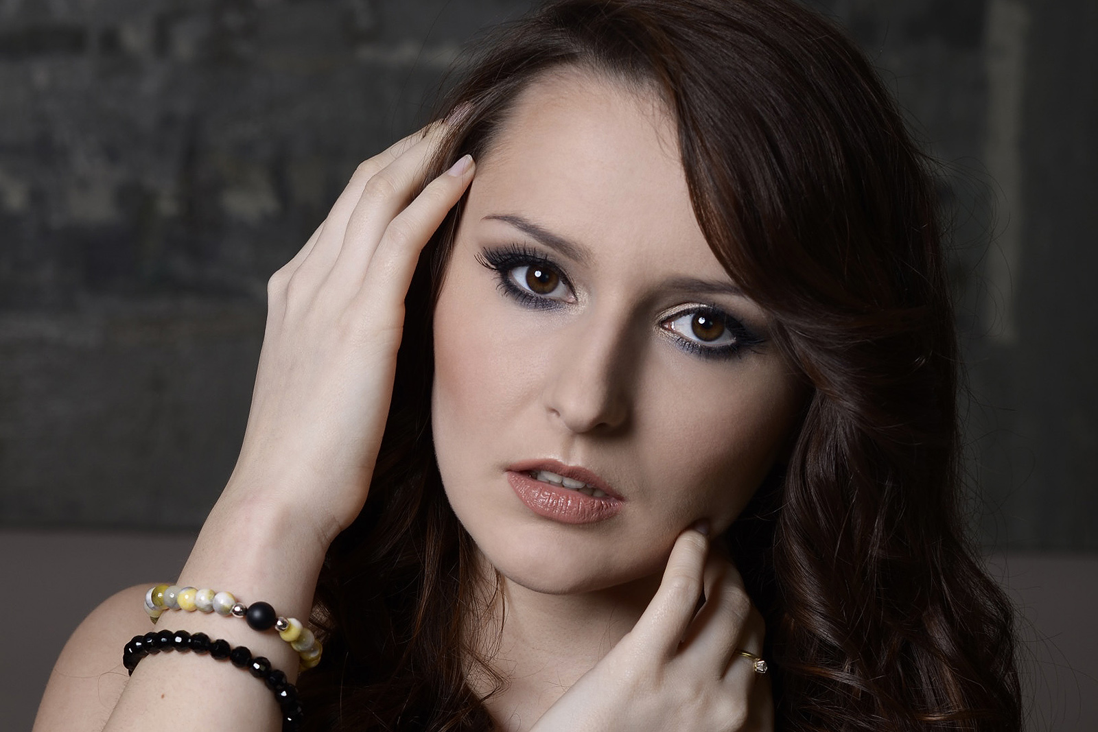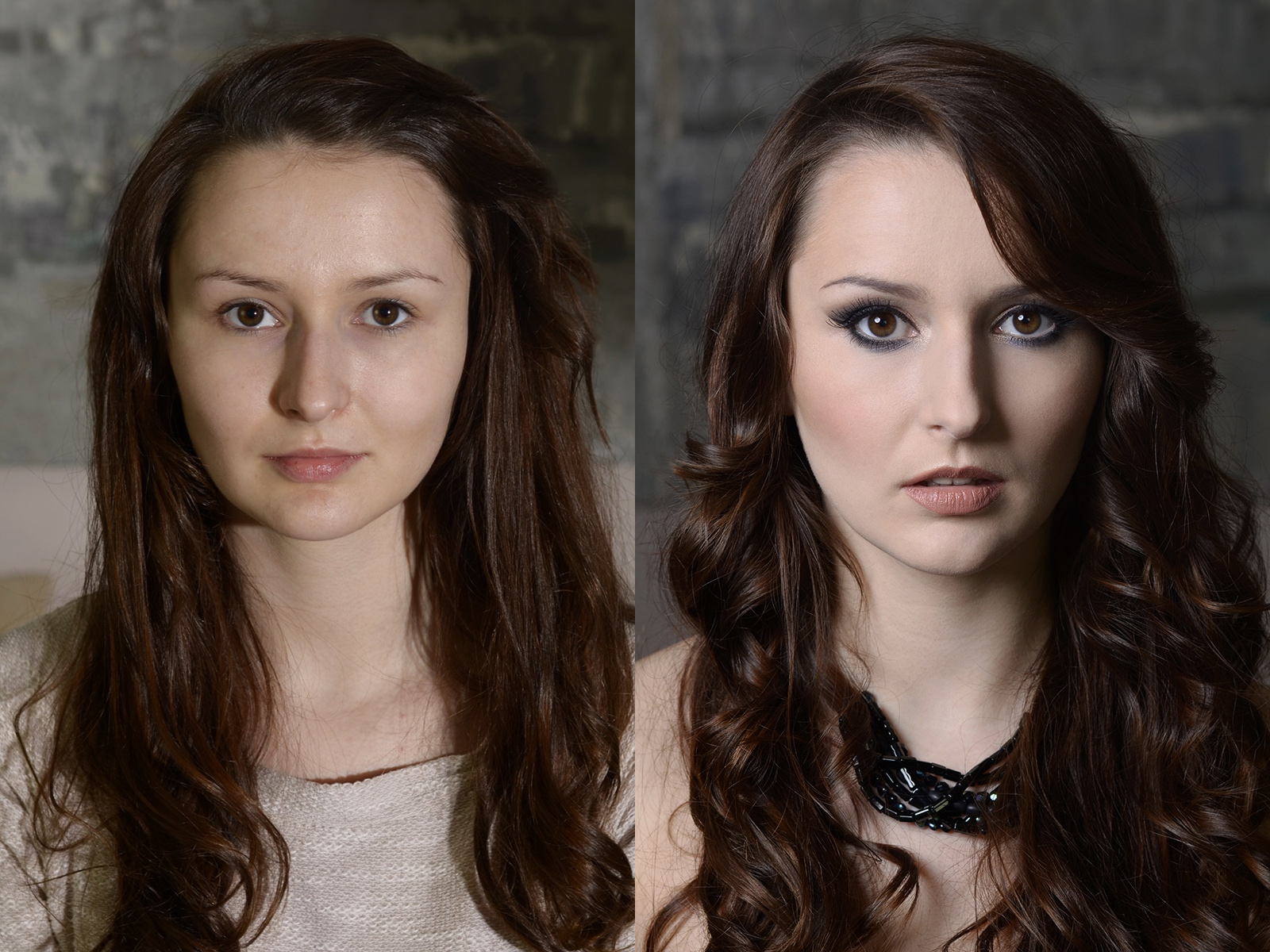 Do tej sesji Agnieszce zaproponowałam makijaż powiększający oczy. Zależało nam, żeby całą uwagę skupić na spojrzeniu. Połączyłam cienie o ciepłej tonacji z grafitem i czernią. Całość wycieniowałam mocniej do góry i mocniej na zewnątrz w zewnętrznym kąciku tworząc charakterystyczne V. Wyciągnięta kreska dodatkowo optycznie wydłużyła oczy modelki. Konturowaniem starałam się poprawić proporcje twarzy. Całości dopełniły neutralne usta w ciepłej tonacji.